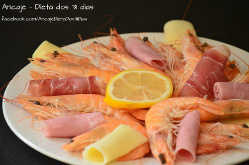 3. Almoço, prato de camarão cozido com queijo, fiambre e presunto, acompanhado por um grande copo gelado de chá verde com gengibre e limão.