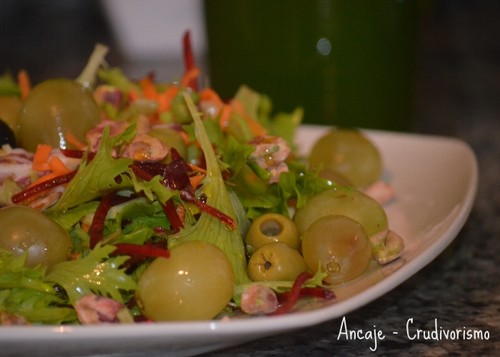 Alface verdinha frisada, azeitonas verdes, pistachios verdesuvas verdes. Daí o nome à salada!