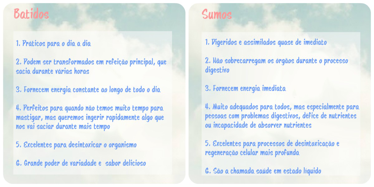Não optem entre sumos e batidos – eles têm características, funções e efeitos diferentes, pelo que ambos devem fazer parte da nossa alimentação! Invistam num liquidificador e numa centrifugadora razoavelmente bons e transportem a vossa saúde e bem-estar ao próximo nível!