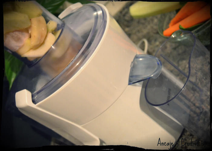 Parte 2 do sumo, adição das cenouras e espinafres! Como é necessária uma grande quantidade de frutas e vegetais para fazer o sumo, vou colocando as quantidades, à medida que vão cabendo no tubo da centrifugadora. Neste caso, deixei as cenouras e espinafres para o fim, mas é completamente indiferente a ordem pela qual, colocam os ingredientes na máquina! No fim, mexo com uma colher, para que fique o sumo homogénio!