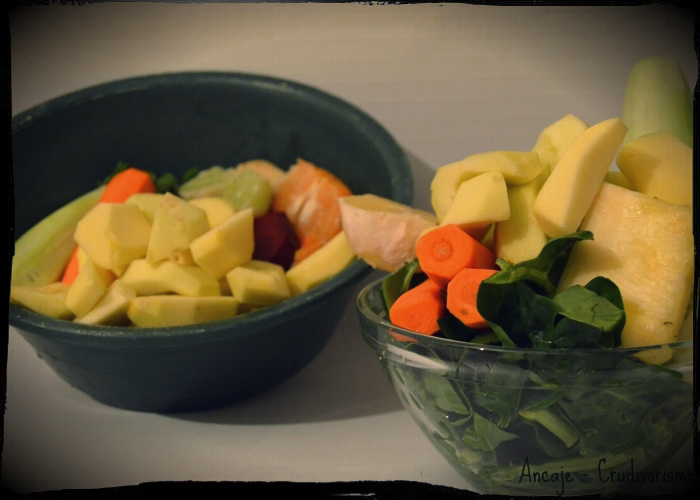 Aqui, os legumes e a fruta, já descascadas e partidas, separadas em 2 recipientes por tipo de sumo, prontas para nuns míseros segundos, se transfomarem em deliciosos sumos!